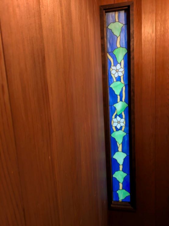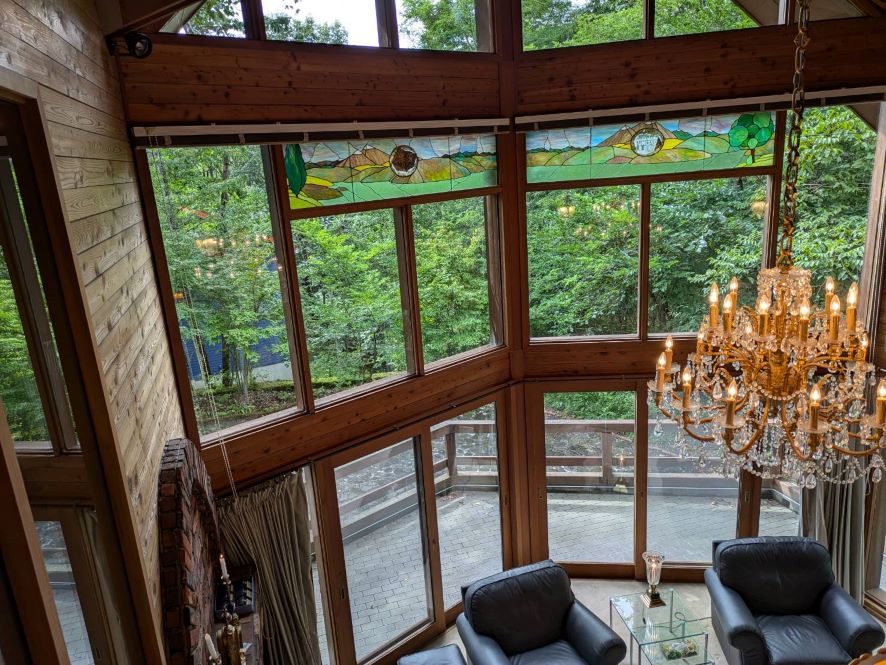 35年前、この別荘を気に入った建築家が購入しました。その建築家は京都駅の建築にも関与した経歴を持ちましたが、建物の傷みが予想以上だったため、建物を取り壊して新たに建て替えました。最初に母屋(242.64㎡)を建築し、翌年には洋画家であった夫人のために別棟アトリエ(96.65㎡)を建て、両棟を約10メートルの渡り廊下で結びました。前の別荘のステンドグラスは新しい別荘にも引き継がれ、母屋リビングには緑〜黄〜淡青の山並み構図のステンドグラスが二枚、アトリエ玄関にはコバルトブルーの背景に黄金色の茎、緑葉と白花を描いた連続植物文様のステンドグラスが飾られています。